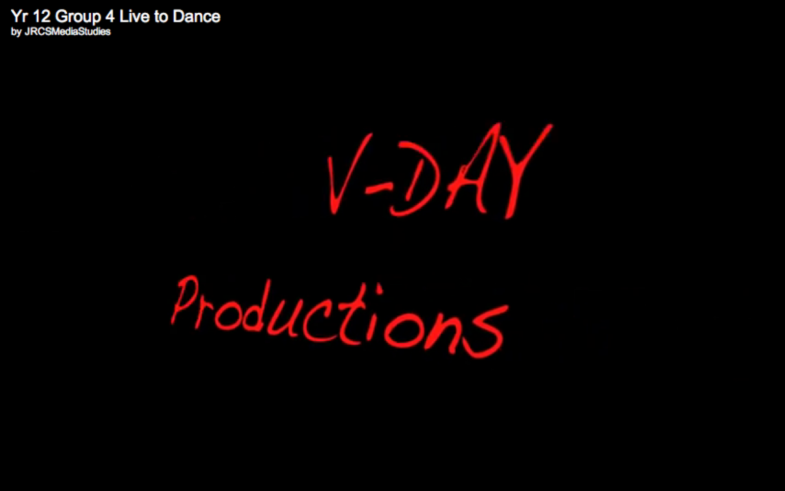 5:title name. At 0:03 we can see the title name "Live2Dance" this is conventional to the dance genre as many films such as streetdance 3d tend to have a reference to dance in their name or numbers and appear to be an urban version of normal words.